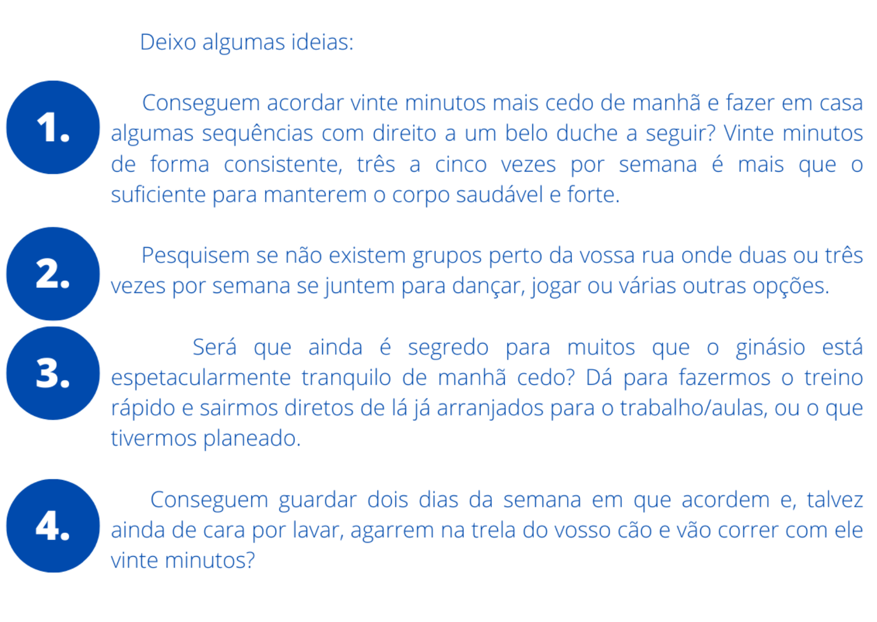 Deixem abaixo mais sugestões de como inserem no vosso dia a dia atividades físicas. Quero ouvir como são as vossas rotinas! E partilharei aqui para que haja esta troca de motivação entre todos.